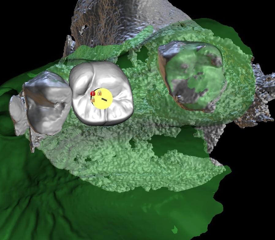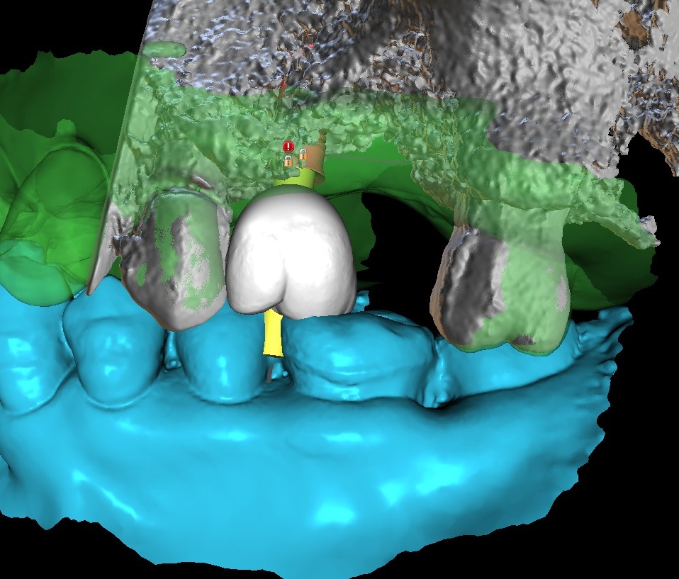 Treatment begins with a comprehensive assessment using CBCT imaging and intraoral scans to evaluate bone levels and plan implant positioning around the final restoration.